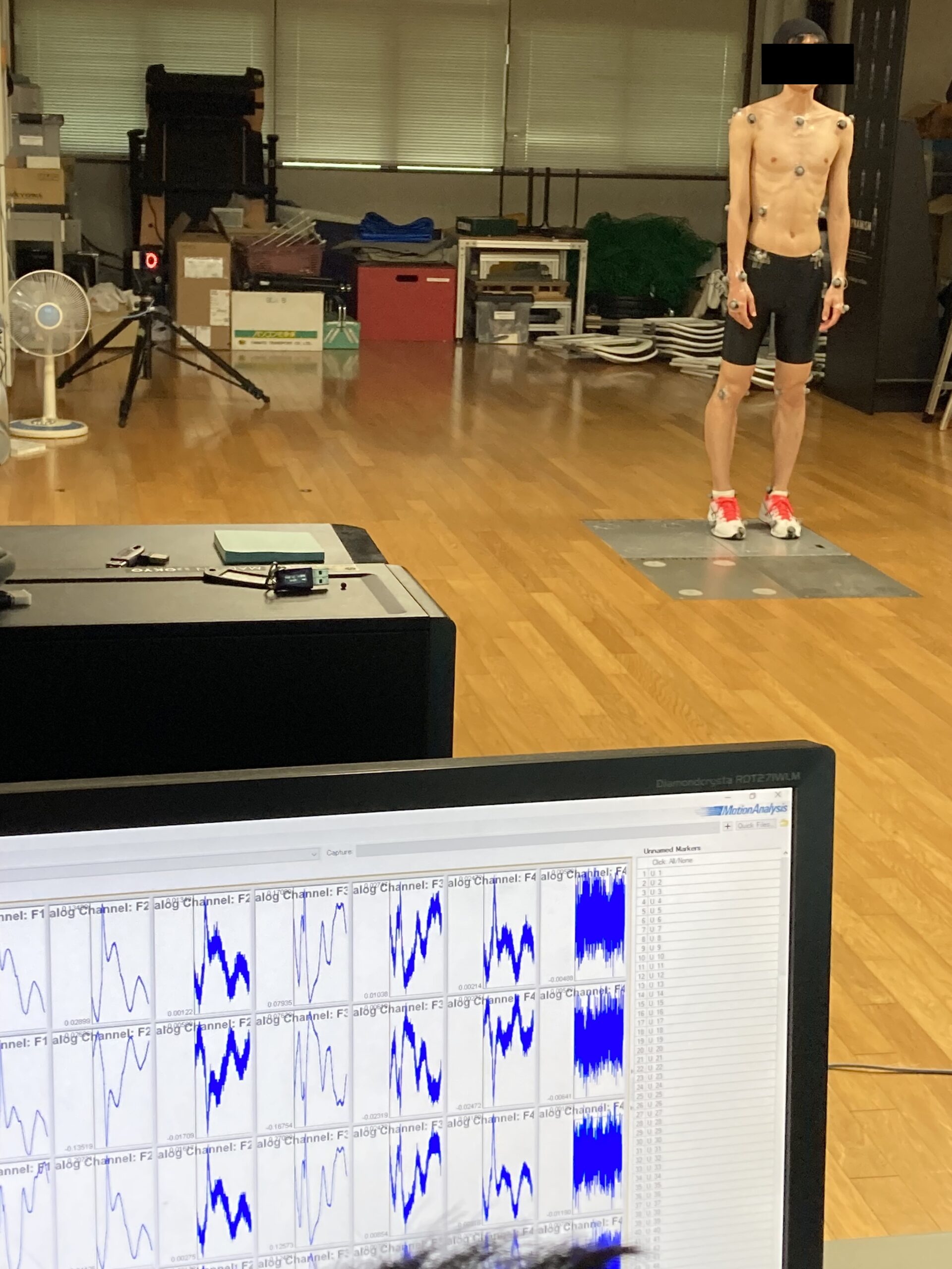 ↑マーカーを装着した状態で、フォースプレート( フォースプレートは歩行や走行など動作をする際にかかる力量を測定できる計器です)に立ち、作動状態を確認中です。