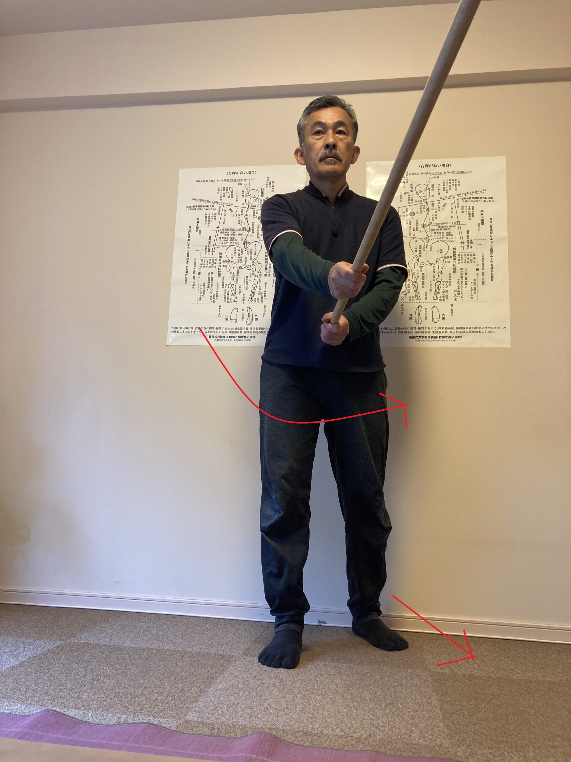 剣道では右脚を前に構えますが、この構えにより、どうしても右脚が長くなりやすいのが股関節のメカニズムです。