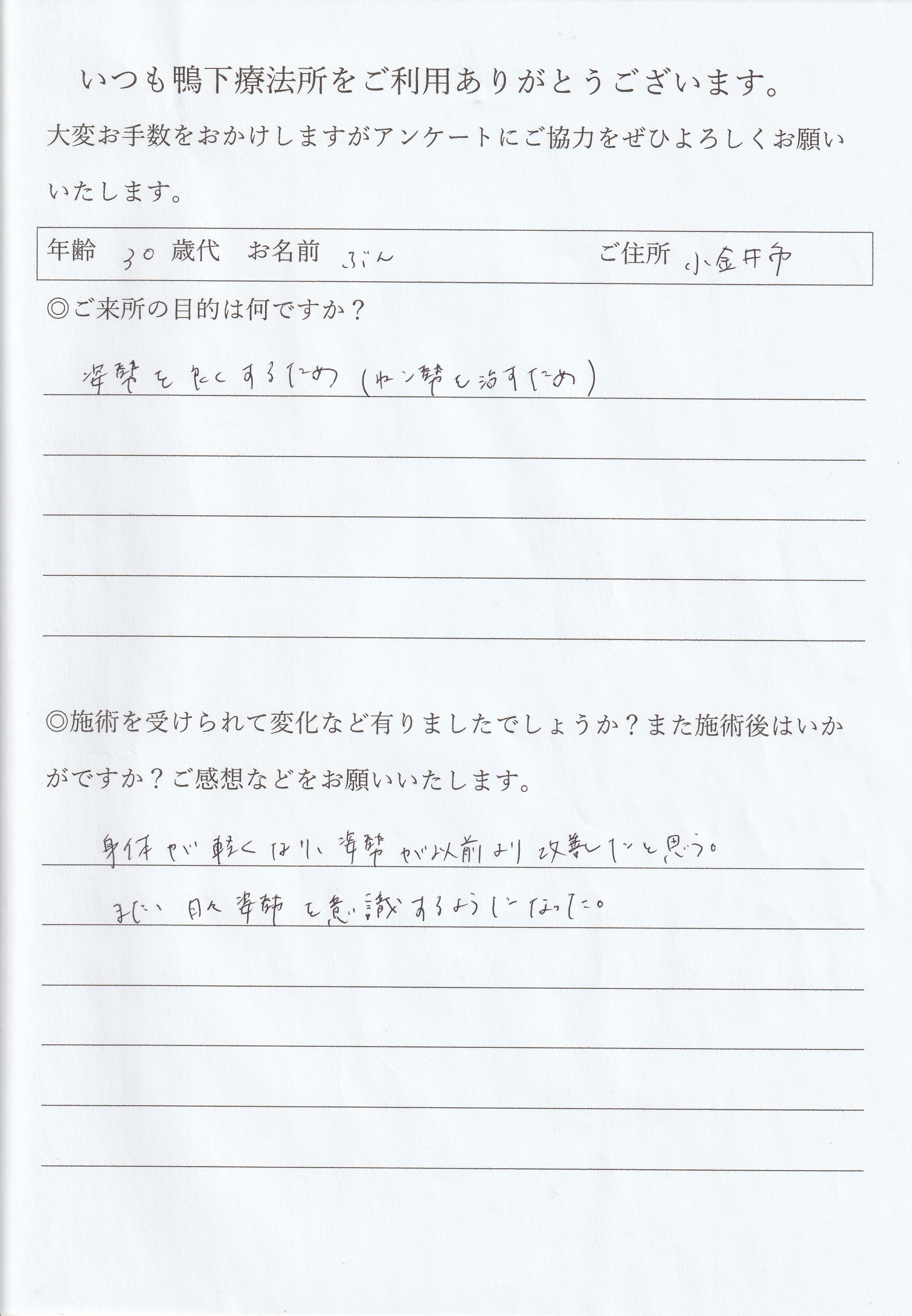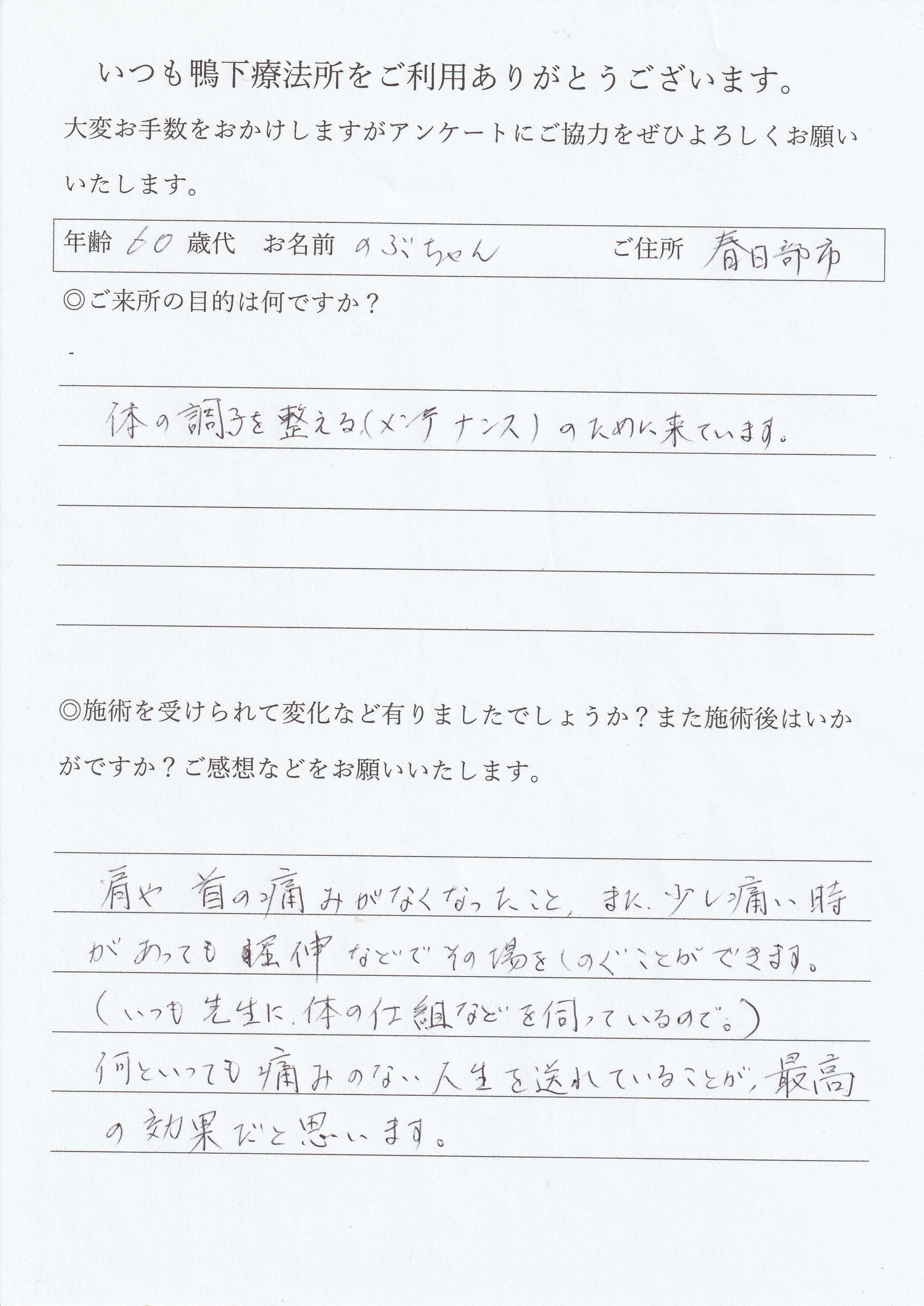 痛みが改善されました。今回来て良かったです。普段の生活のアドバイスをいただき実践していけば良くなると思って頑張ろうと思います。いつも親身にアドバイスしていただき本当に感謝しています。