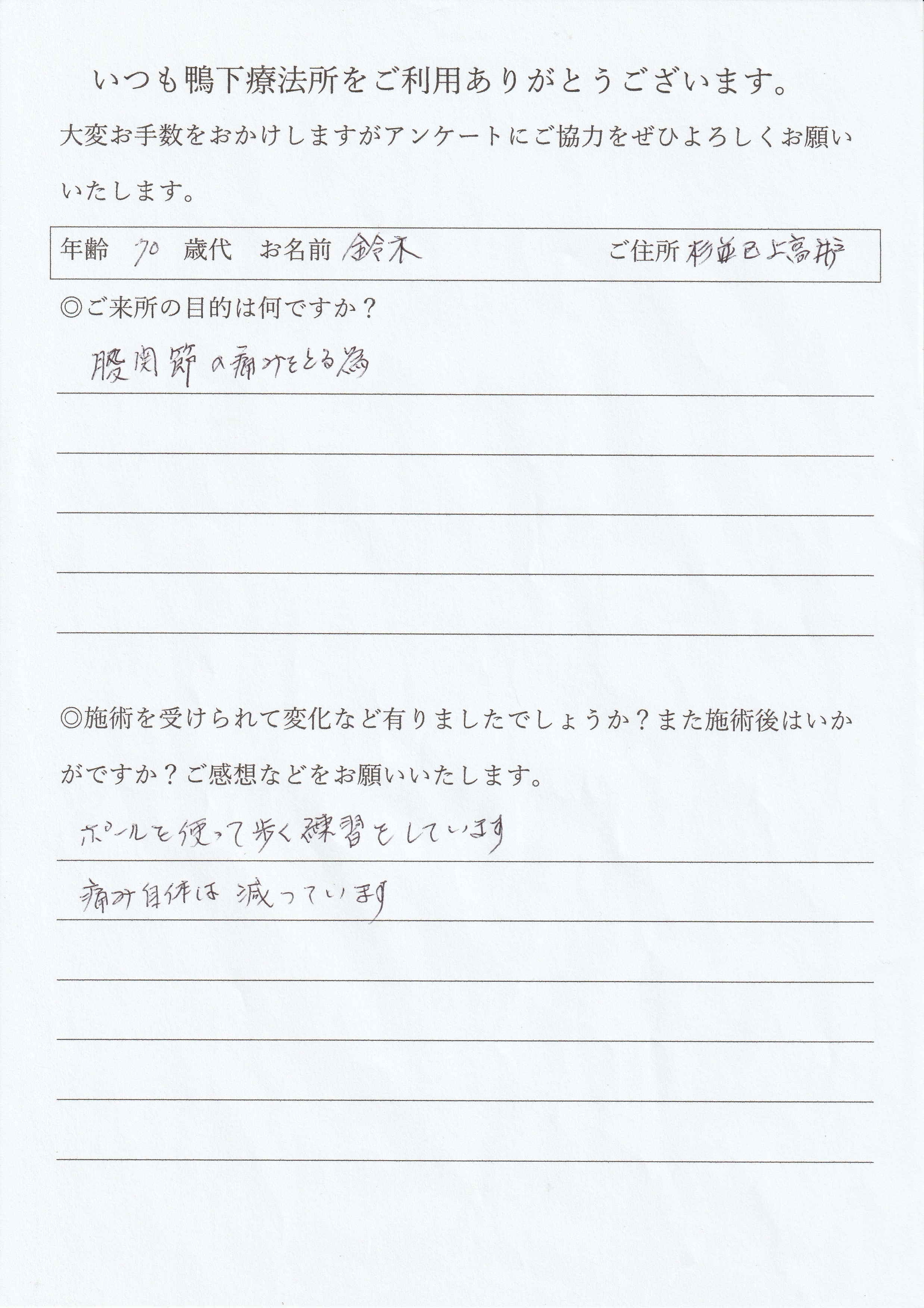 家人もびっくりするような直り方。歩けなかった(動けなかった)施術前がうそのようです。正しい方向の自分にあった運動を教えてくださいました。自分にあった正しい姿勢で自分の筋肉を作っていくということが大切だと思いました。これからもご指導よろしくお願いします。